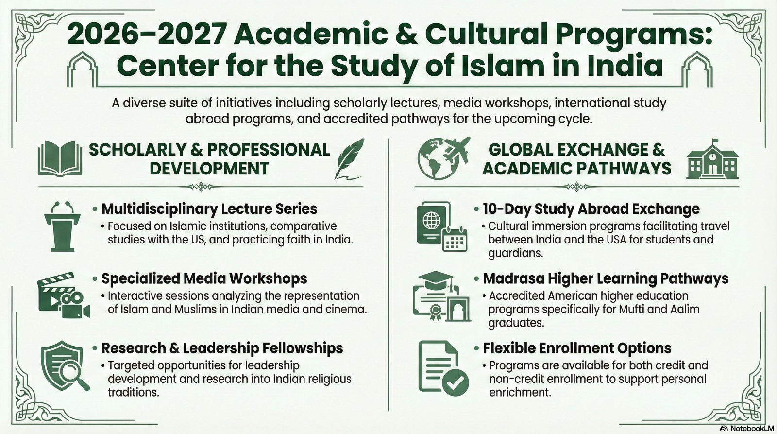 The Center on Islam in India envisions American Islamic College as a leading global hub for the study of Islam in India, one that connects classical Islamic scholarship with contemporary inquiry, amplifies underrepresented intellectual traditions in Urdu, Persian, and Arabic, and fosters informed dialogue on Islam, India, and the subcontinent, pluralism, identity, and democracy. The Center aspires to shape scholarly discourse, educate future leaders, and contribute to a more nuanced global understanding of Islam in India through accessible, high-impact academic and public programming.